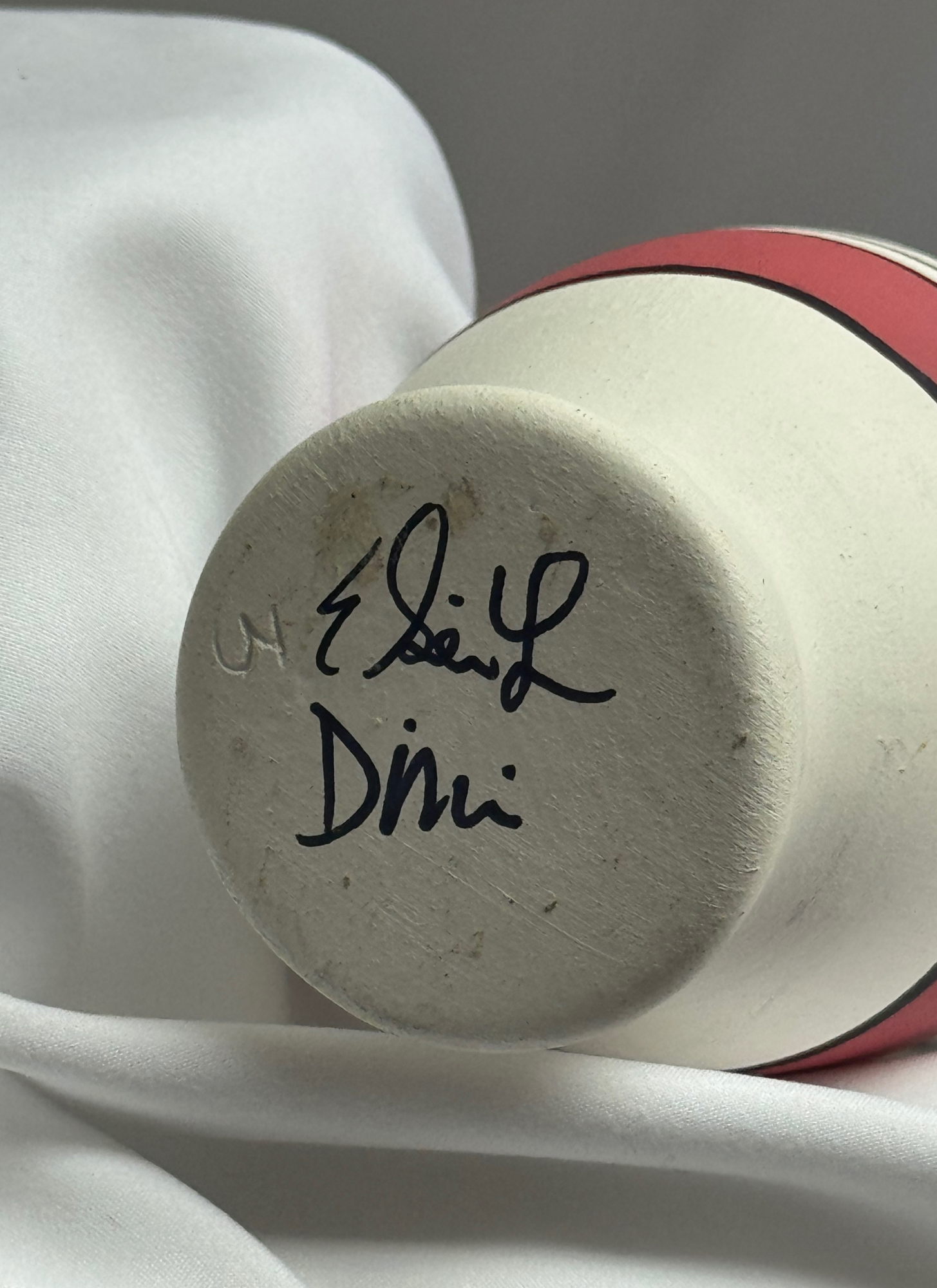 The underside bears the maker’s signature, preserved as found. While the artist remains unidentified, the marking provides a direct point of provenance—evidence of authorship rather than branding. The piece reflects a moment when ceramics occupied a space between domestic object and visual art, intended to live within a home without requiring explanation.